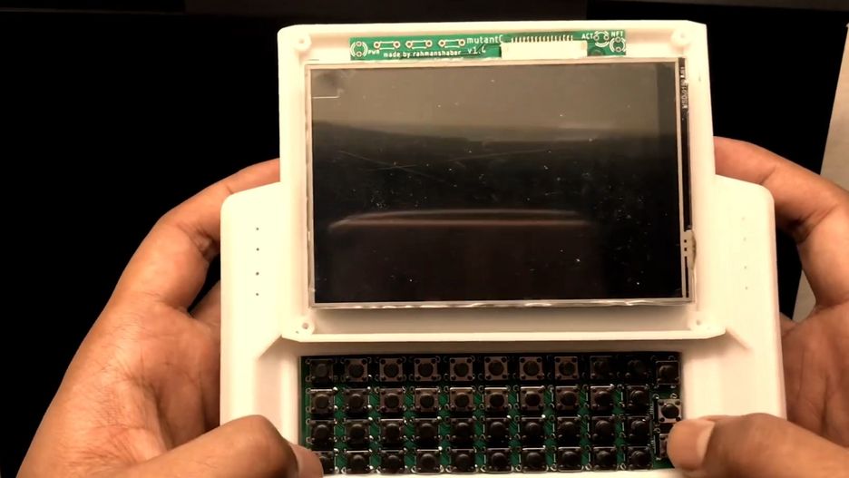 Autor projektu podłączył do płyty niewielki dotykowy wyświetlacz, klawiaturę z 43 przyciskami, głośniki, płytkę Sparkfun Pro Micro i zamknął wszystko w specjalnie zaprojektowanej obudowie z drukarki 3D. Oczywiście nie obyło się bez dodatkowych kabelków, złącz i śrubek, aby wszystko było spięte i trzymało się w jednym kawałku.