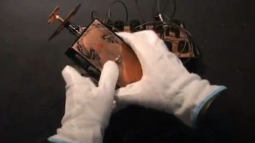 Wystarczy wziąć w ręce to niewielkie pudełko przymocowane przewodami do większej, wyposażonej w pokrętła jednostki centralnej, a następnie kierować je w różne strony. Generowana "muzyka" powstaje w oparciu o kierunek oraz siłę odbieranego sygnału. Niby prosta zabawka, ale rezultat niezwykły. Twórca dla podkreślenia efektu zaprezentował swoje dzieło w białych rękawiczkach.
