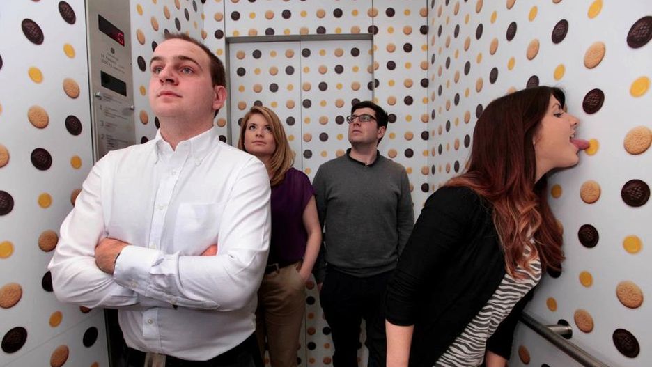 Wyobraźcie sobie, że jedziecie spokojnie windą, gdy nagle jeden ze współpasażerów zaczyna... lizać ścianę. Apetycznie wyglądające ciastka sprawiły zwyczajnie, że nie mógł się powstrzymać. Gdzie można przejechać się taką niecodzienną windą?