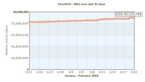 Jeśli wierzyć danym opublikowanym przez AppData, liczba graczy FarmVille przekroczyła 80 milionów! Co ważne, nie oznacza ona użytkowników, którzy wyłącznie założyli konto, ale wskazuje aktywnych graczy, korzystających z aplikacji w ciągu ostatnich 30 dni.