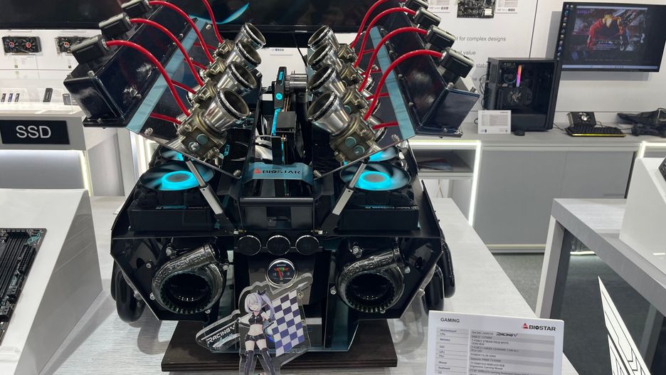 Komputer w kształcie silnika samochodu to pomysł firmy Biostar, która ma w swojej ofercie płyty główne z serii Racing. Sporym zainteresowaniem cieszył się również komputer przypominający oczyszczacz powietrza oraz zestaw złożony w obudowie kształcie buta - Cooler Master Sneaker X.