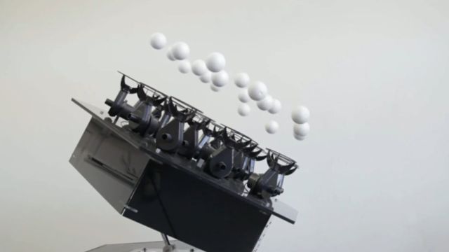 Urządzenie widoczne na fotografii to Floating Orchestra. Za pomocą dedykowanej aplikacji i ekranu dotykowego możemy sterować wysokością, na jakiej unosi się każda z 19 białych piłeczek.