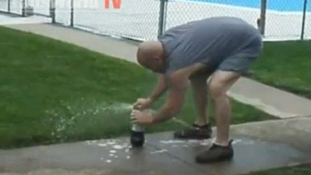Trajektoria lotu butelki nie mogła być lepsza. Swoją drogą ciekawe, czy operator ucierpiał podczas wykonywania nagrania, czy kamera zdołała przyjąć na siebie całą energię uderzenia.