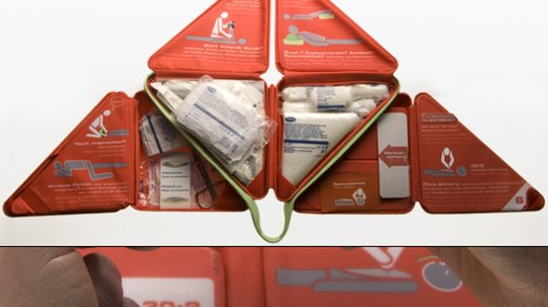 Autorka koncepcji nie dostarcza zbyt wielu informacji odnośnie wyposażenie apteczki. Z załączonych zdjęć możemy jednak wywnioskować, że zestaw zawiera m.in.: sterylne gaziki, bandaże, plastry, nożyczki chirurgiczne i chustę trójkątną. Nie widzę wody utlenionej ani środków przeciwbólowych. First Aid Support Kit zawiera za to specjalny telefon, którym połączymy się z numerem alarmowym.