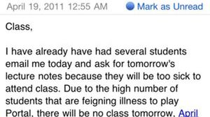 Otóż wielu uczniów poprosiło wcześniej profesora o podesłanie notatek z zaplanowanego wykładu, ponieważ choroba ścięła ich z nóg. Nauczyciel zwęszył podstęp i postanowił odwołać zajęcia ze względu na to, że choroba uczniów zbiegła się w czasie z premierą gry Portal 2. Dziwne, prawda? A mówią, że nauczycieli powinno się palić na stosie...