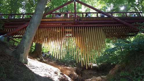 Jak widać na zdjęciach, mamy tu do czynienia z dość sporą konstrukcją. Powstała ona na wystawę Sculpture by the Sea w duńskim Aarhus, a jej oficjalna nazwa to Chimecco. Pod mostem widzimy aż sześćset aluminiowych, złoconych rurek. Każda ma średnicę pięciu centymetrów, ale różnią się znacznie długością - od 12 do 375 centymetrów.