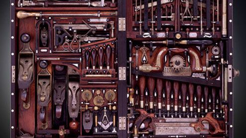 O kunszcie wykonawcy świadczy idealne dopasowania narzędzi do przeznaczonych im miejsc. Wiele z nich wsuwa się w nie z charakterystycznym „klikiem”. Nieźle jak na taką staruszkę. Skrzynia została oznaczona symbolami masońskimi, włączając w to słynny trójkąt i cyrkiel