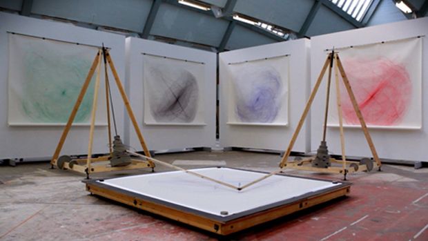 Urządzenie nazwane przez swojego twórcę Drawingmachine ma wysokość 2,7 m i zajmuje powierzchnię wielkości sporego pokoju. Składa się z dwóch drewnianych statywów, ustawionych na przekątnych płótna oraz wahadeł obciążonych 75-kilogramowymi ciężarkami. Zamiast pędzla i farby używa zwykłego długopisu.