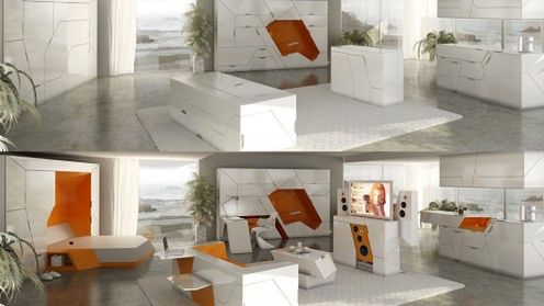 Widoczna powyżej, transformująca się szafka pozwala na wygodne ukrycie panelu o przekątnej do 46 cali, odbiornika 7.1 i stacjonarnego odtwarzacza Bu-ray. Jak widać całość zmniejsza się znacznie po złożeniu i przypomina wtedy nieco większą pralkę. Po rozłożeniu oczom ukazuje się prawdziwe centrum multimedialne.