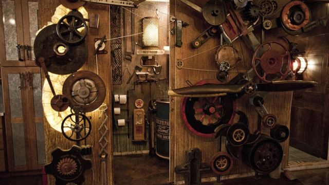 Szczególnie ciekawie prezentują się ukryte za ścianami z kół zębatych łazienki i sypialnia zaprojektowana na podobieństwo rozbitego zeppelina.