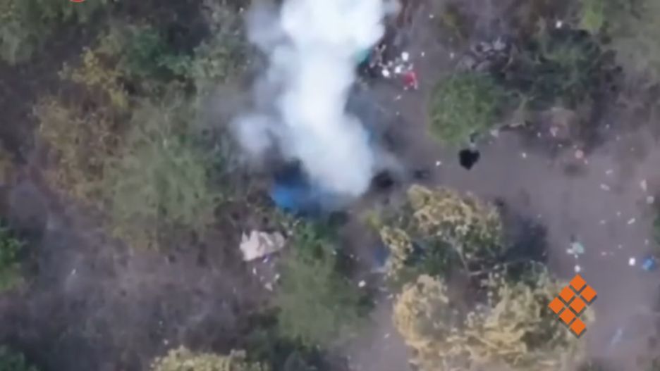Na nagraniu pochodzącym z drona widzimy zrzut jednego ładunku na namiot, z którego po eksplozji uciekają najpewniej członkowie konkurencyjnego kartelu. Następnie dron zrzuca kolejne trzy ładunki. Wyglądają one na subamunicję lub tzw. bomblety pochodzące z amunicji kasetowej.