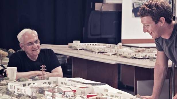 Frank Gehry zmienił ogólną koncepcję Zuckerberga w gotowy projekt. Na stole makieta całego obiektu.