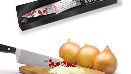 Trochę wygląda jak tasak, ale tak tak naprawdę jest to (prawie) normalny nóż kuchenny o długości 8" (20.32 cm) i wykonany ze stali nierdzewnej. Jak widać na zdjęciu, ma on dość ciekawy design, który mógłby przerazić niejednego gościa. Gadżecik kosztuje 15$.