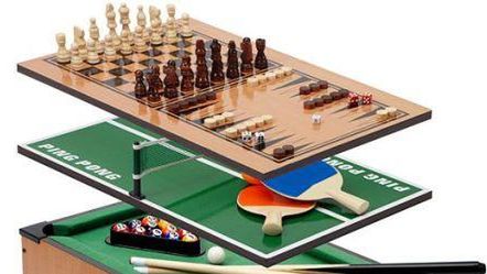 Pudło ma 50 cm wysokości i 30 szerokości. Na samym dole jest boisko do piłkarzyków, nieco wyżej stolik do bilarda, nad nim mały stolik do ping-ponga, a na szczycie planszę do szachów i backgammona. Wszystkie rozrywki posiadają niezbędne elementy - rakietki, bierki, kule, itp. To dobre rozwiązanie, jeśli jedziemy gdzieś na wczasy i akurat leje. Zestaw ten można nabyć na stronie producenta. Cena nie jest jakaś zaporowa i wynosi 49,99 dolarów, czyli około 135 - 140złotych.