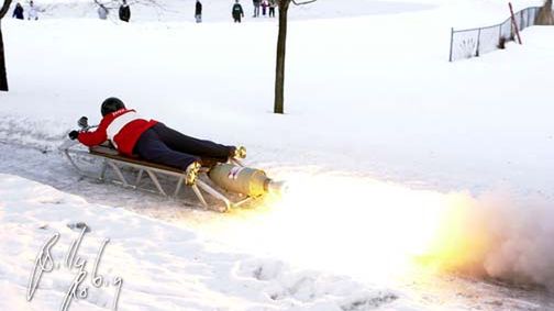W długie nudne zimowe wieczory rodzą się różne dziwne pomysły. Jednym z nich są odrzutowe sanki projektu Ky Michaelsona nazywanego też Rocketmanem. Poza niestandardowym napędem na sanki składają się aluminiowe płozy, dębowy pokład, „kierownica” oraz miernik prędkości. Całkiem nieźle jak na sanki.
