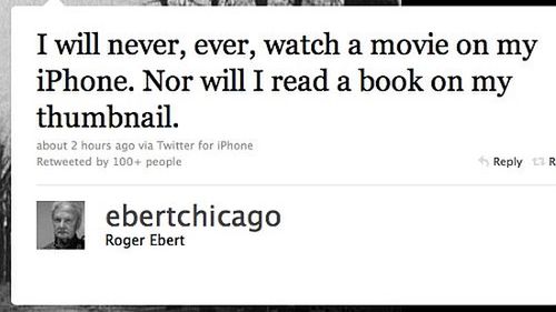 Obecnie filmy można oglądać gdziekolwiek się chce. Dzięki wszelkiej maści PMP (Portable Media Player), potocznie zwanymi mp4 (czasami nawet mp5) playerami, niepotrzebne nam jest kino czy telewizor. Rodzi się jednak pytanie, czy na tak małych ekranach jest sens oglądać filmy? Znany krytyk Roger Ebert ma na ten temat swoje zdanie (na zdjęciu powyżej). A Wy?