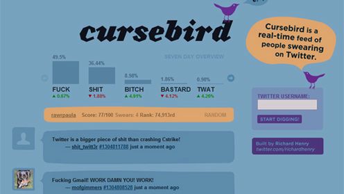 Cursebird na bieżąco pokazuje wszystkie ostatnie przekleństwa jakie rzucili użytkownicy Twittera oraz monitoruje ich częstotliwość. Być może kiedyś socjolodzy lub językoznawcy będą w stanie opracować jakąś teorie wynikającą ze spadku popularności "shit" na rzecz "fuck".