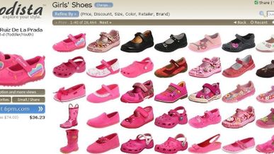 Modista działa inaczej - porównuje buty w bazie na podstawie ich koloru i fasonu, który wcześniej został zdefiniowany przez sprzedawcę. W ten sposób trafiamy na but który nam się podoba, ale -na przykład -nie przekonuje nas jego cena. Zamiast przedzierać się więc przez kolejne partie obuwia dla "ludzi z innego świata", klikamy na wybrany bucik, a serwis proponuje nam obuwie w podobnym do wybranego klimacie.