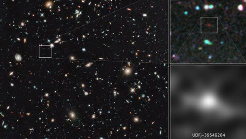Kosmiczny Teleskop Hubble'a znowu pokazał nam coś niezwykłego. Tym razem jest to najstarsza znana galaktyka, jaką znamy- UDFj-39546824. Nazwa co prawda mało ciekawa, ale zauważmy, że obserwujemy ją w momencie zaledwie 480 milionów lat po Wielkim Wybuchu.