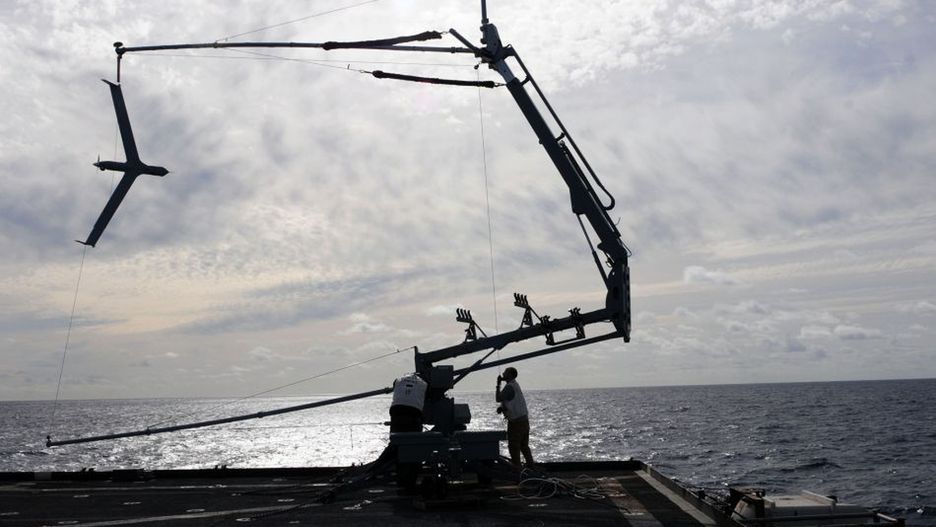 Oto lekki bsl ScanEagle. Startuje z szynowej wyrzutni, ale najciekawszy jest gadżet służący do lądowania. Lekkie bezzałogowce albo lądują na spadochronach, albo są łapane w sieci, albo korzystają z nadmuchiwanych poduszek amortyzujących przyziemienie. Wszystkie te metody wymagają miejsca. AATI opracował inny sposób: potrzebny jest żuraw, na którego końcach rozpięte są linki. Bsl zahacza o nie skrzydłem i jest bez uszkodzeń wyhamowany niemal w miejscu. Jest to duża zaleta, ponieważ dzięki temu można odzyskiwać bezzałogowce nawet na niewielkich pokładach okrętów (chętnie korzysta z tego US Navy) albo w niesprzyjającym terenie, jak bazy w górach Afganistanu.