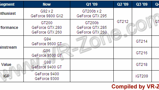 Serwis VR-Zone opublikował informację o planach firmy nvidia na nadchodzacy rok. W pierwszym kwartale nastapi wprowadzenie układów GT200b w kartach GTX 295 (2xGPU) i GTX 285 w segmencie Enthusiast i Performance. Drugi kwartał to wyparcie poprzednich produktów przez nowy GPU GT212 zaś w trzecim kwartale pojawią się grafiki w segmentach Mainstream i Value. Nowy i niecierpliwie wyczekiwany układ GT300 powinien pojawić się dopiero pod koniec roku. Tabelka z planami w rozwinięciu newsa.