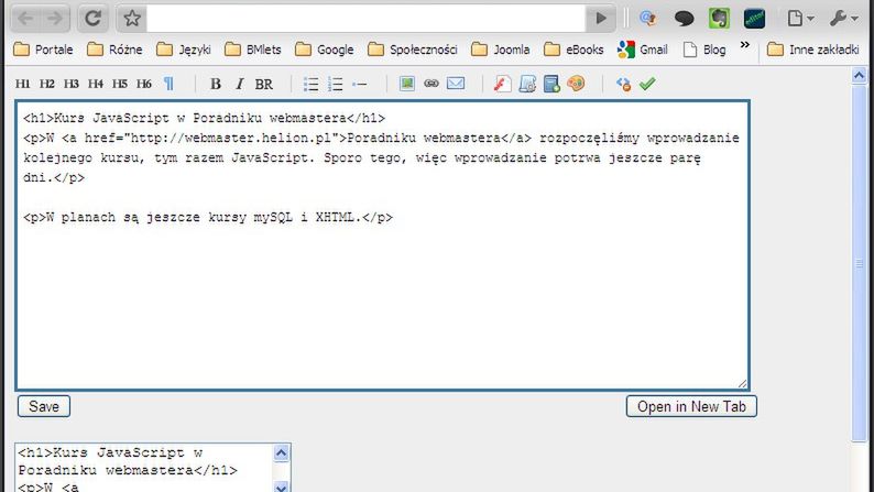 Do dyspozycji mamy wszystkie podstawowe tagi języka HTML, w tym m.in. wstawianie obrazka, a także kilka poleceń dodatkowych. Gdy klikniesz Save, kod zostanie zapisany lokalnie i będzie widoczny pod edytorem, skąd można go w dowolnej chwili skopiować. Na razie nie działa jednak jeszcze podgląd dokumentu. Edytor obsługuje skróty klawiaturowe, aczkolwiek zauważyłem konflikty ze skrótami w przeglądarce.