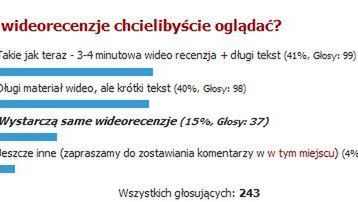Nadszedł najwyższy czas, abyśmy zakończyli na naszym blogu kolejną ankietę. Tym razem pytaliśmy Was o to Jakie wideorecenzje chcielibyście oglądać? Włącznie oddaliście 243 głosy.