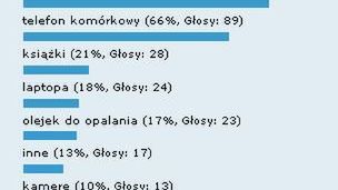 Kolejne cztery miejsca (książki, laptop, olejek do opalania, inne) otrzymały podobną liczbę głosów. Wnioskujemy z tego, że każdy z Was ma inne hobby. Jedni spędzają wolny czas opalając się na plaży, inni czytają świetne książki, a pozostali z Was cenią sobie jeszcze inne rozrywki.