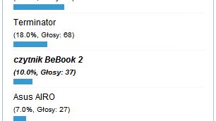 Terminator też okazał się hitem aż dla niemal jednej piątej respondentów. Szkoda że BeBook zebrał tylko 10% głosów, jednak chyba cena pozostaje największą barierą w popularyzacji czytników ebooków.