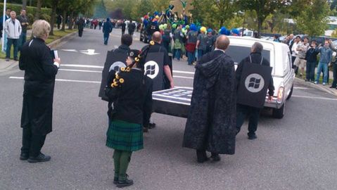 Ceremonia pogrzebu iPoda i BlackBerry odbyła się na terenie kampusu w Redmond. Jak widać po zdjęciach, wszystko zostało dopracowane idealnie - czarne stroje, wieńce żałobne, nie zabrakło i księdza! Olbrzymie modele (zapewne tekturowe) BlackBerry i iPhone'a były najpierw niesione, potem pojechały czarnym wozem.