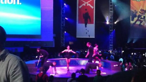 Nagranie nieco z odległości, ale wydaje mi się, że chyba były przebrane za Larę Croft. Na miejscu tej w środku złapałbym gościa za frak i wyrzucił ze sceny. Albo wykorzystał okazję, aż się pochyli, i kopa zasadził.