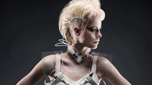 Suknia w kolorze sterylnej bieli przypominająca minimalizm niektórych gadżetów wygląda co najmniej jakby wyciągnięto ją z dalekiej przyszłości. Modelka wciśnięta w ten dziwaczny kostium jest niczym robot, który ma dobrze się prezentować i służyć jako mobilny automat do napojów. Czyżby ostatni krzyk mody?