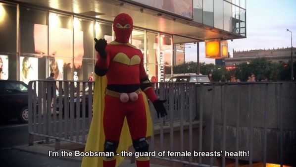 Typowy z całą pewnością nie jest też Boobsman, choć chciałby się z amerykańskimi superbohaterami kojarzyć - po pierwsze przez imię, które sobie nadał, po drugie przez charakterystyczny obcisły strój i pelerynę.