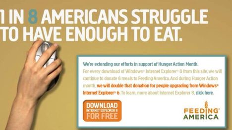 Przebudowana kampania, która dzisiaj ruszyła, teoretycznie ma na celu pomóc głodującym. Została jednak sprytnie wykorzystana do reklamowania IE 8 i jednoczesnego usuwania "szóstki" z naszych komputerów. Jak już wspominaliśmy przy okazji opisywania poprzedniej wersji kampanii, Microsoft zebrał spore cięgi, ponieważ za równowartość 1,15 dolara (a tyle było warte jedno pobranie przeglądarki) trudno byłoby kupić aż 8 posiłków.