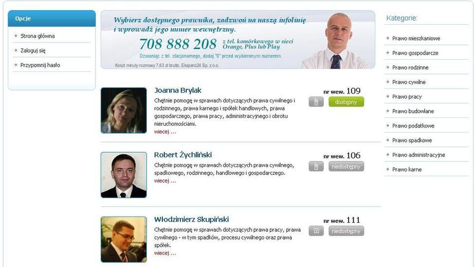 Brakuje tu możliwości wysłania maila, czy porad on-line. Zapewne problemem byłoby rozliczenie takiej porady, czego nie można powiedzieć o poradzie telefonicznej, gdzie za minutę rozmowy zapłacimy 7,63 zł brutto. Może jednak bardziej opłaca się pójść do specjalisty osobiście.