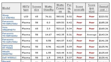 Serwis cnet zainwestował kilka dolarów, zatrudnił niedożywionego studenta, który za niewolnicza stawkę odwalił brudną robotę. Wynikiem tego jest bogate zestawienie porównujące zużycie prądu przez różne telewizory HD.