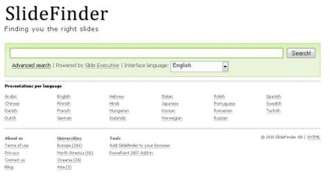 Slidefinder to nic innego jak wyszukiwarka prezentacji w Power Point. Można wpisać w wyszukiwarkę temat jaki nas interesuje, lub przeglądać prezentacje według języka w jakim zostały napisane. W sierpniu 2009 roku, Slidefinder został spolszczony i można dzięki niemu znaleźć również polskie prezentacje.