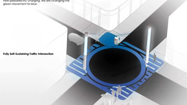 Grupa studentów zaprojektowała skrzyżowanie, którego sygnalizacja zasilana jest energią pochodzącą z wibracji wywoływanych przez przechodzących pieszych i jeżdżące samochody. Projektanci, Ian Jaye, Jovan Popovic oraz Patrick Houin, wykorzystali w swoim pomyśle zjawisko piezoelektryczne, które przetwarza wibracje na energię elektryczną. Choć piezoelektryka znana jest od przeszło 100 lat, nie jest szeroko rozpowszechniona we współczesnej technologii.