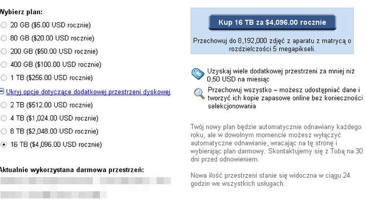 Okazało się, że za 4 tysiące dolarów użytkownik będzie mógł opublikować najwyżej milion fotografii. Oczywiście dotyczy to tylko Picasy - zdjęcia da się wrzucać także do Dokumentów Google czy Gmaila. Brakuje tam jednak wygodnych opcji udostępniania i przeglądania.