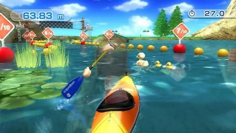 Gunn opisywał też widoczną na fotce powyżej grę River Rush. To dwuosobowa mini gierka polegająca na, co za zaskoczenie, spływie kajakowym. Oczywiście sterujemy własnym ciałem, więc by skręcić w prawo musimy ruszyć się w prawo, w lewo - w lewo itd. Artysta zaznaczał, że gra była męcząca i że dla wielu graczy to może być największy problem.