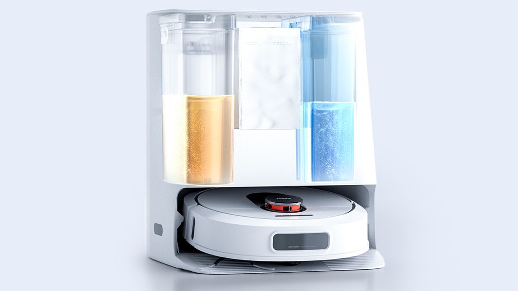 W stacji dokującej znajdują się dwa 4-litrowe zbiorniki – jeden na czystą wodę, a drugi na nieczystości. Gdy robot wróci, aby się naładować, stacja będzie pompować czystą wodę ze zbiornika po prawej stronie, myć nakładki mopujące i przepompowywać nieczystości do drugiego zbiornika. Cały proces przebiega automatycznie.