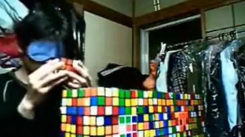 Podejrzewam, że ten wielce znudzony amator układania kolorowych kwadracików ma opracowaną technikę, którą stosuje do każdej z kostek. Zasłonięte oczy są tylko dodatkiem, który dodaje nieco "dramaturgii" do całej imprezy.