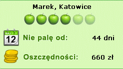 Kira pisała w marcu o tym, co nałogowcy uzależnieni od nikotyny, mogą wykorzystać w rzucaniu palenia. W zasadzie napisała o wszystkim, ale ? dla wielu palaczy niezwykle silną motywacją do rzucania palenia jest motywacja finansowa. Kiedy uświadomimy sobie, że w ciągu roku puszczamy z dymem wakacje na Kostaryce, to może to człowiekiem wstrząsnąć. Na umiłowaniu mamony i rozsądku uzależnionego (niezły oksymoron, prawda?) bazuje nowy serwis społecznościowy dla palaczy (a raczej ex-palaczy) ? jabłuszkowo.pl. Precyzyjnie wyliczy on, ile zaoszczędzasz - nie paląc.
