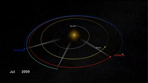 STEREO jest parą statków kosmicznych wystrzelonych w październiku 2006 roku. Od tego czasu poruszały się one po tej samej orbicie co Ziemia, lecz dopiero przedwczoraj (po 4 latach) znalazły się w pozycji, z której możliwe jest obserwowanie całego Słońca. W ciągu kolejnych 8 lat statki mają zamienić się miejscami. W tym czasie mają dostarczyć informacje na temat całej powierzchni i atmosfery naszej najbliższej gwiazdy.