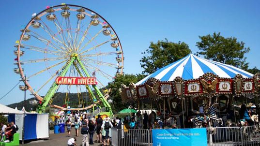 Nie jestem pewien czy diabelski młyn tego miasteczka znalazłby miejsce w naszym TOP 10 takich konstrukcji, ale na pewno ucieszy fanów ekologicznych źródeł energii. Ciekawe ile panele generują prądu? Musi go trochę być bo telebim z diod LED i nagłośnienie miejscowej sceny jest w pełni zasilane energią słoneczną. Podobnie jak widoczna powyżej karuzela.