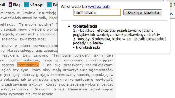 Słownik nie działa kontekstowo. Konieczne jest kliknięcie ikony i wpisanie lub wklejenie wyrazu i kliknięcie przycisku Szukaj w słowniku. Być może w następnych wersjach pojawi się lepsza integracja z przeglądarką. Jednak już teraz trudno przecenić jego przydatność, gdyż po pierwsze, przyda się przy lekturze tekstów spotykanych w Internecie, w których pojawiają się rozmaite trudne wyrazy blokujące zrozumienie tekstu, po drugie, możemy z niego skorzystać wtedy, gdy chodzi nam po głowie jakiś wyraz, a nie jesteśmy do końca pewni jego znaczenia - szybkie sprawdzenie w słowniku pozwoli błysnąć erudycją na forach czy w serwisach społecznościowych, a przynajmniej nie dać innym powodu do drwin, gdybyśmy użyli niewłaściwego słowa.
