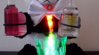 Pewnie zastanawiacie się, co co chodzi z tym misiem i dwiema buteleczkami?! Działanie jest banalnie proste. Na początek należy włączyć SOBEaRa i dmuchnąć mu w twarz. Miś sprawdzi nasze stężenie alkoholu w wydychanym powietrzu i zadecyduje czy nalać nam *coś mocniejszego *(lewa ręka) lub zwykły sok (prawa ręka). Jest też upojenie średnie, kiedy to pluszak nalewa pół na pół. Prawda, że fajne?