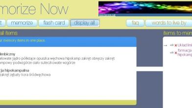 Zasada działania jest prosta. Wpisujemy nazwę (temat) ?karteczki? ? np. ?układ limbiczny? a poniżej uzupełniamy to, co chcemy zapamiętać ? np. ?ciało migdałowate, hipokamp, zakręt obręczy, zakręt przyhipokampowy, sklepienie, podwzgórze, ciało suteczkowate, wzgórze?. W ten sposób możemy stworzyć dowolną ilość ?karteczek?. Kiedy już jesteśmy gotowi, przystępujemy do zapamiętywania danych. Memorize Now daje całkiem sporo opcji ? pozwala wyświetlać odpowiedź w wielu formach ? zarówno jako listę z pominiętymi słowami (im więcej razy naciśniecie ?>? tym więcej informacji zostanie ukryte), jak i jako listę samych pierwszych (lub wybranych) liter. (jeśli najedziemy kursorem na literę ujawni nam się całe uryte słowo). Memorize Now pozwala też korzystać z ?karteczek? tak, jak korzystamy z nich tradycyjnie (opcja Flash card), czyli pokazać nam pytanie (temat) a następnie pokazać odpowiedź. Po sprawdzeniu informacji możemy zaznaczyć to, czy udało nam się odpowiedzieć. Po zakończonej sesji uczenia się, komputer poda nam podsumowanie. Korzystając z opcji "display all", możemy też po prostu wyświetlić sobie całą listę naszych pytań wraz z odpowiedziami.