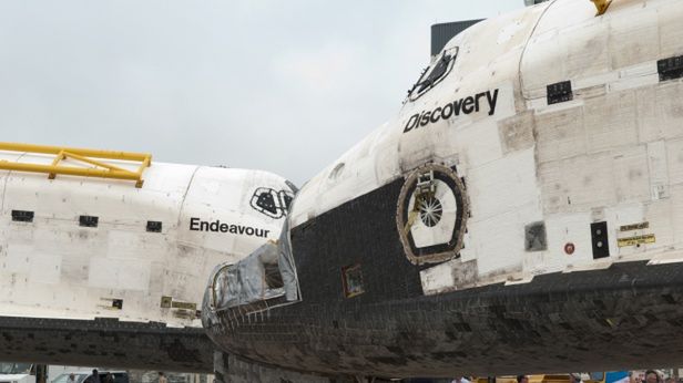 Trzy słynne promy kosmiczne zakończyły już swoją służbę i teraz znajdują się w Centrum Kosmicznym Kennedy'ego. Atlantis, Discovery oraz Endeavour przechodzą teraz proces przygotowania do publicznej prezentacji. Z uwagi na to, że w Centrum jest za mało miejsca na przygotowanie wahadłowców na raz, potrzebna była mała zamiana. Dzięki temu powstały te unikatowe zdjęcia.