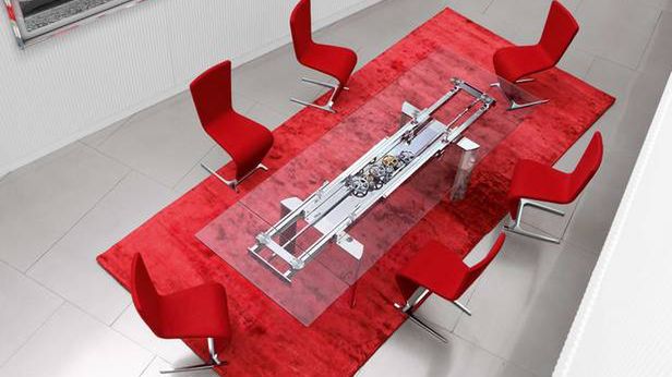 Stół Astrolab na pierwszy rzut oka nie wyróżnia się niczym szczególnym – jak przystało na porządny mebel tego typu, ma klasyczny blat i cztery nogi, jednak powierzchnia stołu nie bez powodu jest przezroczysta. Kryje się pod nią skomplikowany mechanizm z licznymi kołami zębatymi. Szczegóły mechanizmu można zobaczyć po kliknięciu poniższego zdjęcia.
